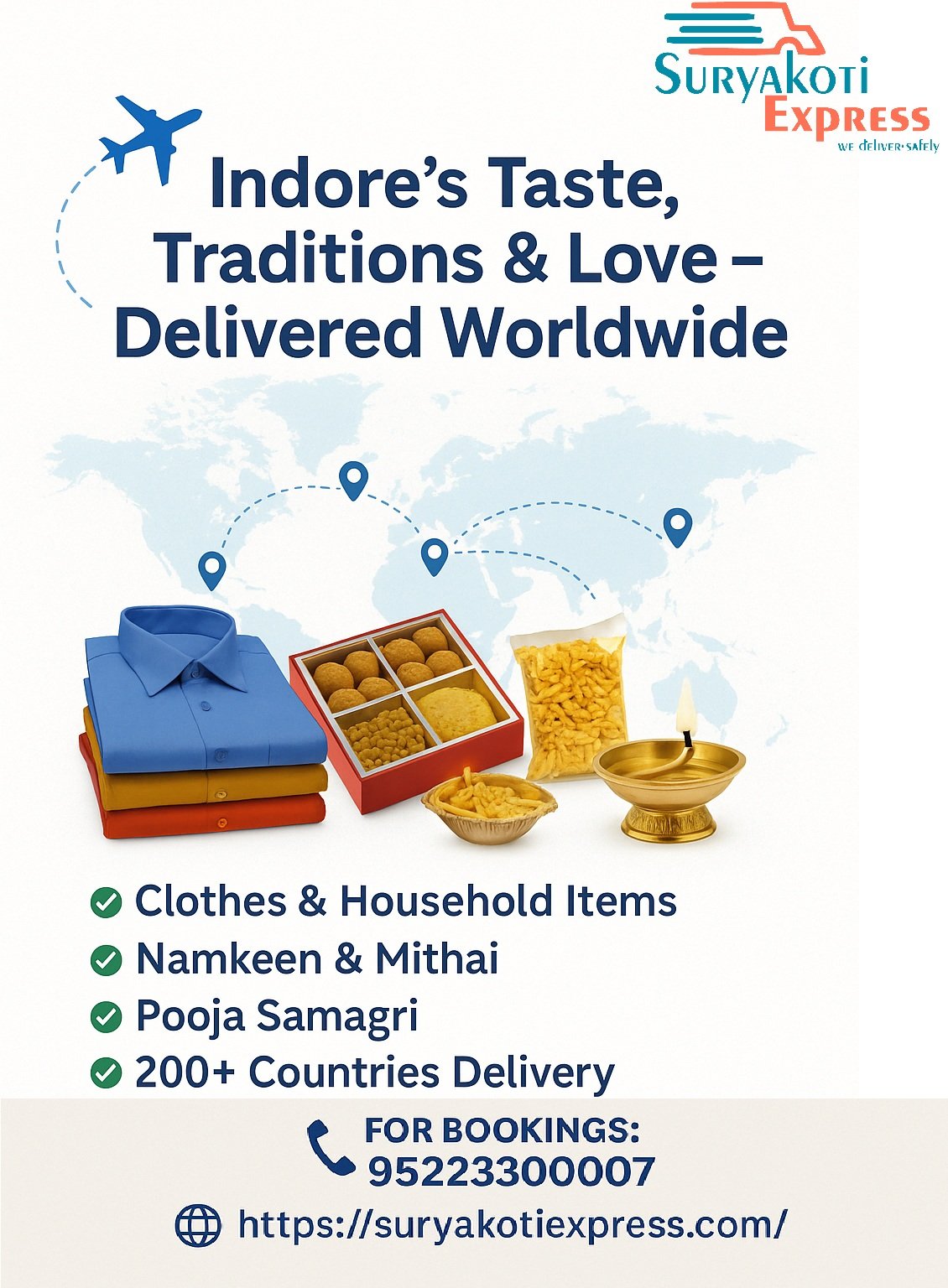 Suryakoti Express helps you send Clothes, Namkeen, Mithai, Pooja Samagri & Documents from Indore to relatives living abroad β fast, safe and hassle-free.